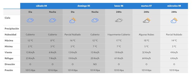 El sábado se mantienen estas condiciones con nubes, temperaturas en ascenso y ráfagas intensas. La máxima ascenderá a las 12 y el viento a 23 k/h. El domingo sale el sol y se espera un día agradable con el termómetro trepando hasta los 16 grados y vientos calmos.