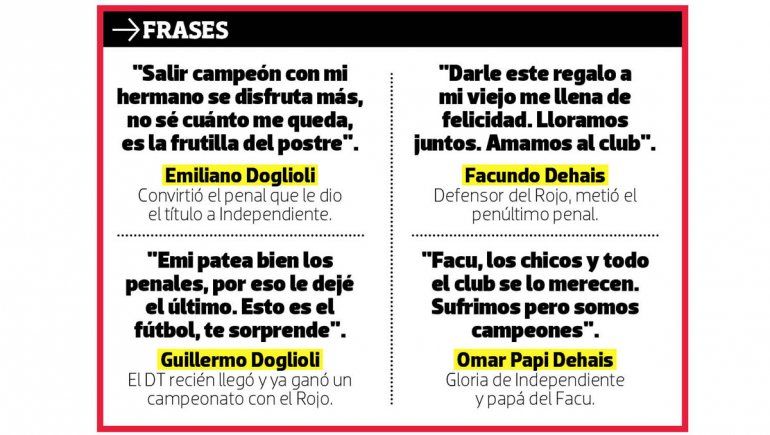 “Emi patea muy bien los penales y quedamos que si se definía desde los doce pasos, ejecutaba él el último. Y por suerte se dio. Es una alegría, justo es mi hermano pero esto es fútbol, son las cosas lindas”, asegura Guillermo, el entrenador del Rojo, que consiguió el primer título en el club en el primer torneo que disputa en forma íntegra.