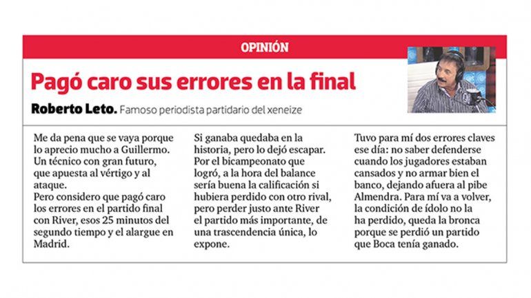 Buenos aires. Crónica de un final anunciado. Guillermo Barros Schelotto dejó su cargo en Boca luego de una comunicación mantenida con la dirigencia. La derrota en la superfinal fue el detonante, si bien aun ganando el partido soñado no era seguro que continuara.