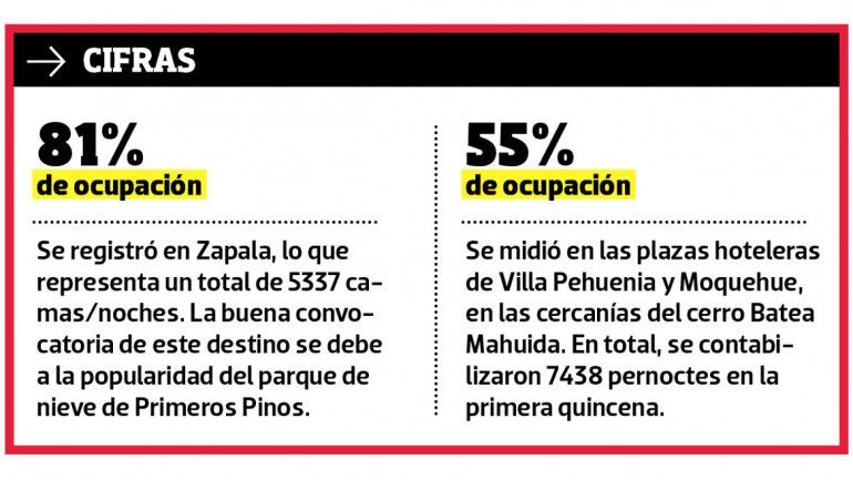 La ocupación promedio en todos los destinos neuquinos y para los primeros quince días de julio fue del 57%, lo que equivale a 125 mil pernoctes. La cifra representa un crecimiento del 28% con respecto al mismo período del año pasado, que equivale a 22.730 camas o noches más vendidas.