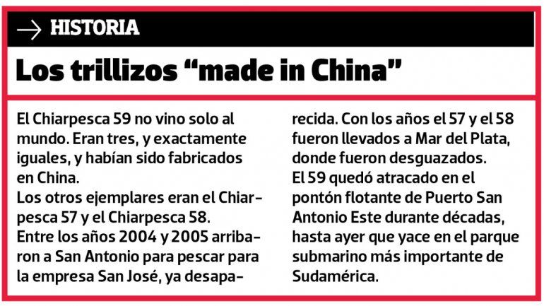 Es el Chiarpesca 59, un antiguo pesquero de 30 metros de largo que fue hundido cerca donde yace desde febrero de este año el Mariana Rojamar y desde 2008 el Don Félix. La embarcación fue sumergida ayer en un nuevo operativo que consistió en trasladar al viejo buque con el remolcador Viento hasta el lugar que previamente había sido señalizado de acuerdo con lo establecido.