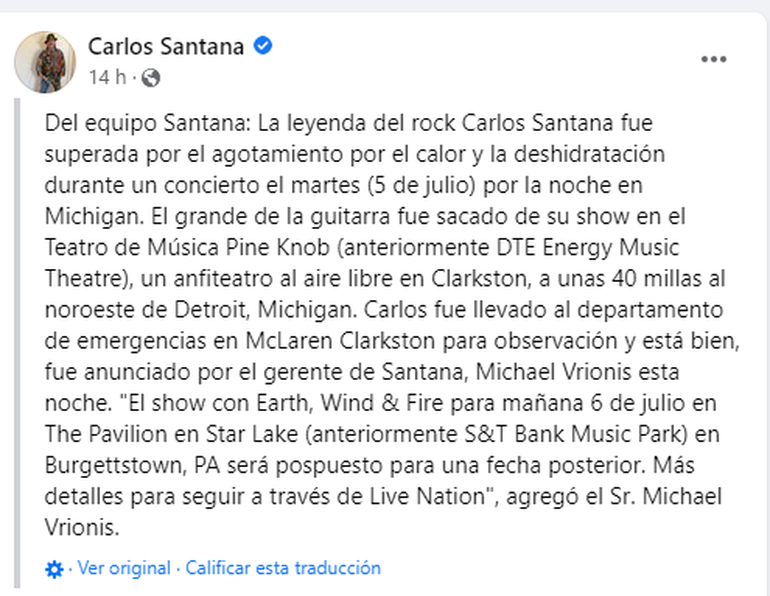 Luego, en un posteo publicado en la cuenta de Facebook del artista, su equipo de trabajo describió la causa del desmayo: provocado “por el agotamiento, el calor, y la deshidratación”. En este sentido, las temperaturas en Clarkston alcanzaron los 33 grados, muy superior al promedio de la época.