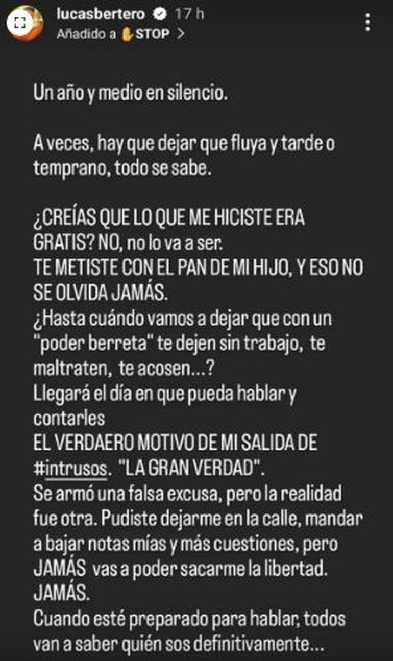 Y agregó: “Llegará el día en que pueda hablar y contarles el verdadero motivo de mi salida de Intrusos. ‘La gran verdad’”. “Se armó una falsa excusa, pero la realidad fue otra. Pudiste dejarme en la calle, mandar a bajar notas mías y más cuestiones, pero jamás vas a poder sacarme la libertad. Jamás”, remarcó.