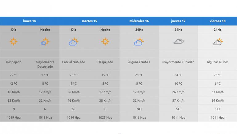 Para el lunes, la temperatura oscilará entre -2°C y 22°C. El cielo estará despejado. Por su parte, el martes, el termómetro tocará los 23°C, mientras que la mínima descenderá hasta 5°C.