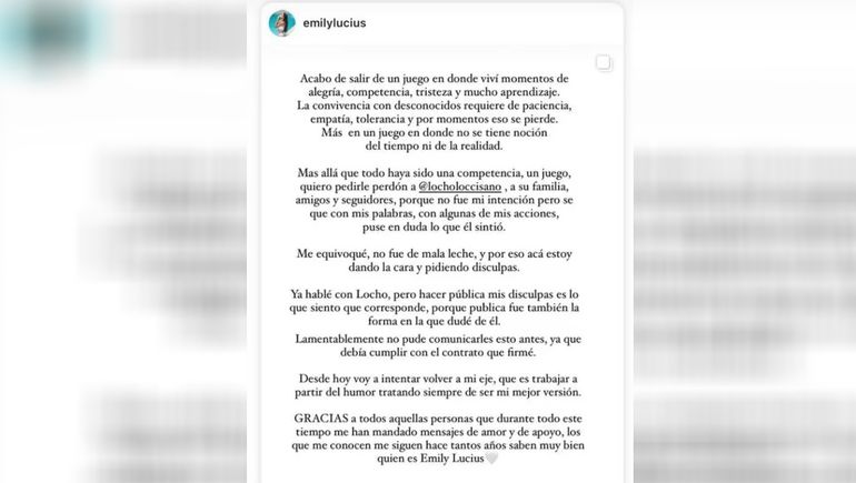 "Más allá que todo haya sido una competencia, un juego, quiero pedirle perdón a Locho Loccisano, a su familia, amigos y seguidores, porque no fue mi intención, pero sé que con mis palabras, con algunas de mis acciones, puse en duda lo que él sintió", escribió la influencer en su pedido de disculpas público.