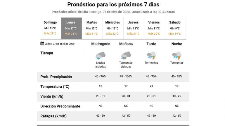 Para mañana, día para el que se mantiene la alerta, durante todo el día, en donde se intercalarán las lluvias aisladas y lloviznas. La mínima será de 12ºC, mientras que la máxima llegará a 18ºC. Para la noche del lunes, están pronosticadas fuertes ráfagas de viento, que llegarán a los 50km/h.