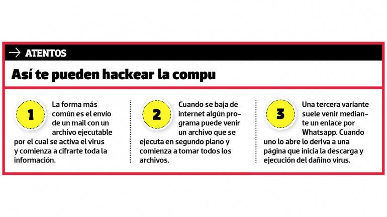 Por su parte, Sebastián, que es un usuario particular, sufrió el mismo ataque hace 10 días. “Mi hijo bajó un parche para un juego y debe haber ejecutado algo porque después me apareció toda la información cifrada”, contó el hombre.