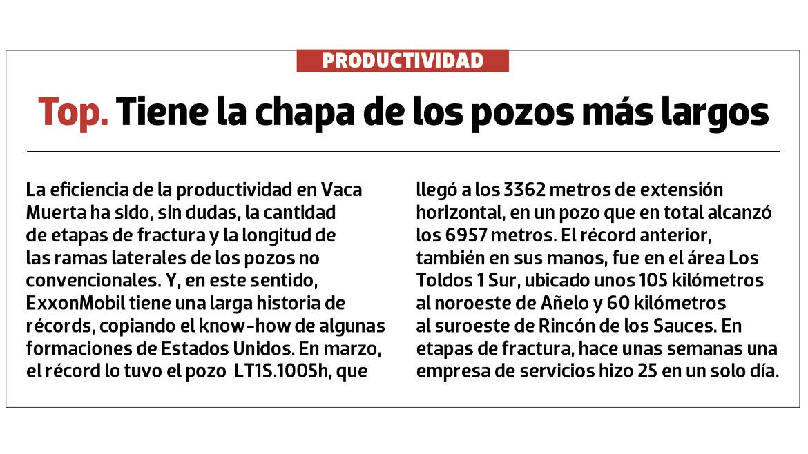 El plan de Exxon es hacer 90 pozos horizontales, un know-how que ha desarrollado en forma eficiente en otras cuencas de los Estados Unidos con algunas medallas encima y cifras récord en Vaca Muerta: buscar una geología más rica, productiva y rentable con más de 3000 metros de rama lateral y 50 etapas de fractura.
