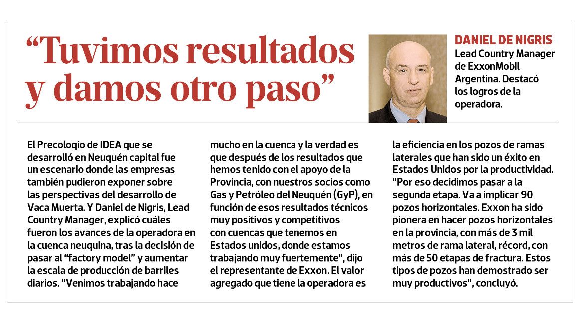 “Nos alientan los excelentes resultados obtenidos en nuestro proyecto piloto en Neuquén y esperamos un aumento de la producción a través de esta expansión significativa”, dijo Staale Gjervik, vicepresidente senior de No Convencionales de ExxonMobil.