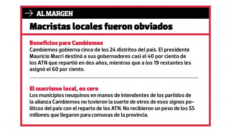 En el periodo contemplado, Nación distribuyó $8469 millones en ATN, según datos de la Jefatura de Gabinete y el Ministerio del Interior que fueron difundidos por el diario La Nación. Del total, $5102 millones fueron para municipios ($3741,5 millones a intendentes oficialistas) y el resto para las gobernaciones. En el reparto salieron ganando intendentes y gobernadores del oficialismo, salvo por el caso de Neuquén.