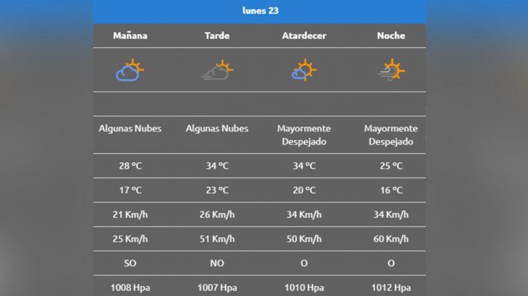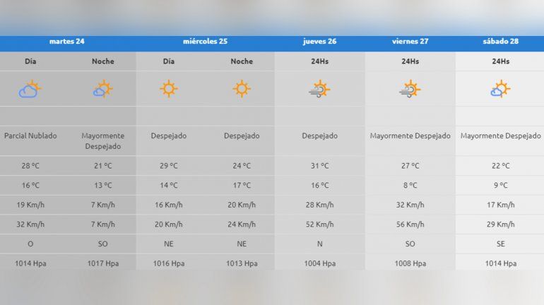 Para mañana el pronóstico indica una jornada con algunas nubes con una temperatura máxima de 28° y una mínima de 16°.