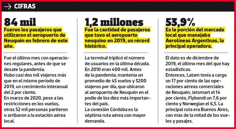 En las compañías hay expectativa por el regreso, pese a que el contexto no ayuda: junto con la aceleración de los contagios, este mes cerró Aeroparque por obras de ampliación que se extenderán hasta fin de año, y la justicia bonaerense se prepara para definir si clausura El Palomar. En estas condiciones, el 2020 se perfila como un año difícil de remontar para la aeronavegación comercial neuquina.