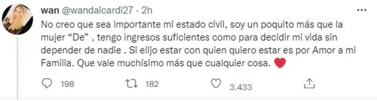 Desde las playas europeas decidió publicar un contundente mensaje en su cuenta de Twitter. “No creo que sea importante mi estado civil, soy un poquito más que 'la mujer de', tengo ingresos suficientes como para decidir mi vida sin depender de nadie”, comenzó diciendo la mayor de las Nara.