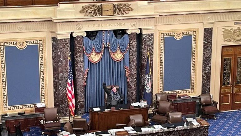 También mostró una imagen del interior del recinto del Senado, en el que se ve a un manifestante sentado en el lugar del titular de la cámara, el mismo asiento que hasta hacía unos minutos había ocupado el vicepresidente, Mike Pence, quien según medios de comunicación fue evacuado del edificio como el resto de los legisladores.
