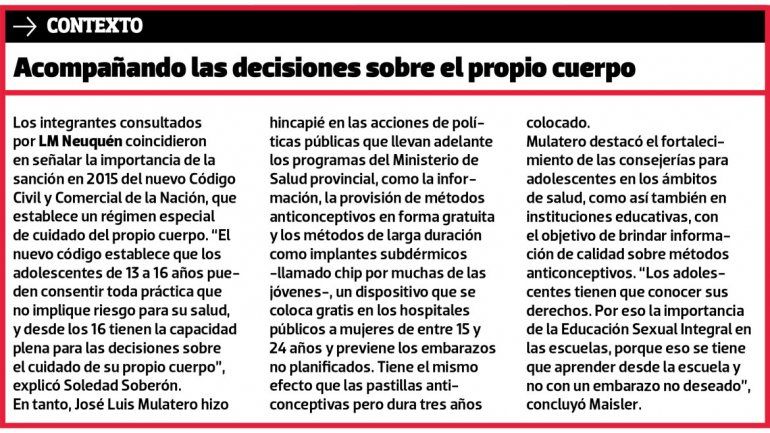 Soledad Soberón, referente del programa de Salud Sexual y Reproductiva, consideró que la madre adolescente “no tiene información de los riesgos”. “Me parece que el principal riesgo está asociado a lo social, en indagar el porqué del embarazo en una niña. Después, cuando accede a la atención y control del embarazo en el sistema de salud, se entera de todo lo otro que conlleva”, expresó Soberón.