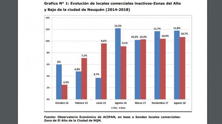 En la zona del Bajo sondeada se registraron 105 locales cerrados o en alquiler sobre un total de 981, mientras que en noviembre del 2017 eran 90 sobre los 868 que se registraron. En tanto, en el Alto se registraron 164 locales inactivos sobre 1390 relevados, contra 158 cerrados en noviembre de 2017 sobre un total de 1351.