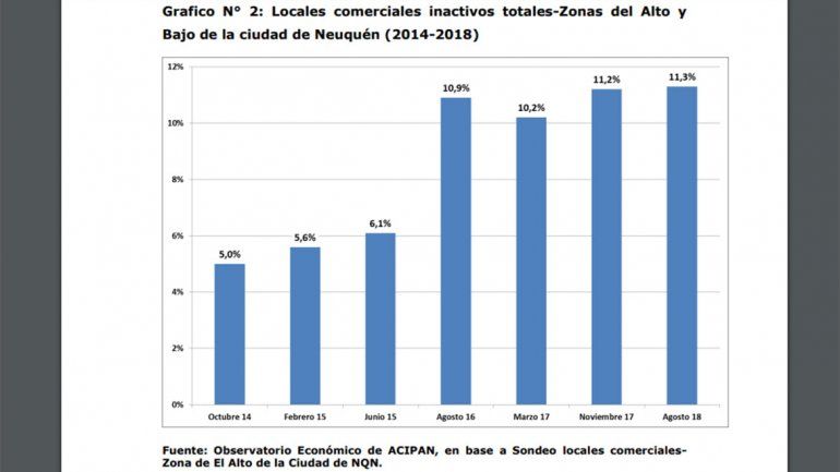 En octubre del 2014, por ejemplo, había un 5% de locales cerrados; en junio del 2015 se registró un 6,1%, mientras que en agosto del 2016 el porcentaje se elevó a un 10,9%.
