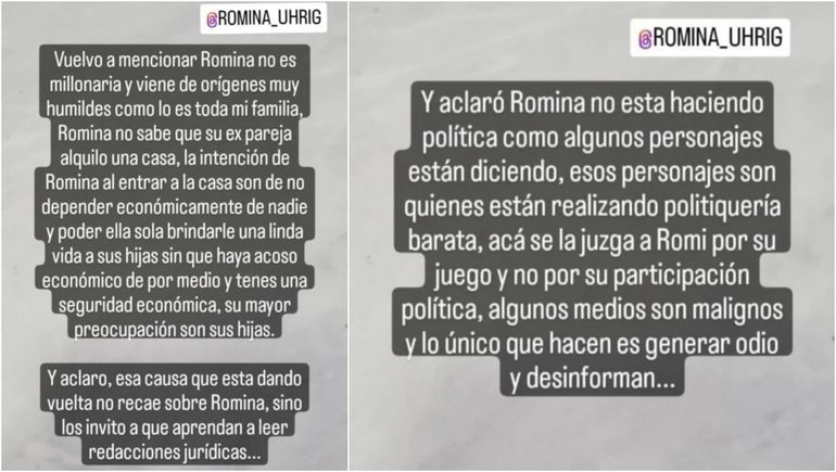 "Vamos a aclarar las cosas, Romi no es millonaria, ni tampoco se victimizó de pobre. Cabe recalcar que ella está separada hace más de seis meses, la separación le trajo mucha inestabilidad económica, mucho miedo en afrontar nuevamente otra vez la vida sola, pero esta vez con tres nenas", reveló el joven.