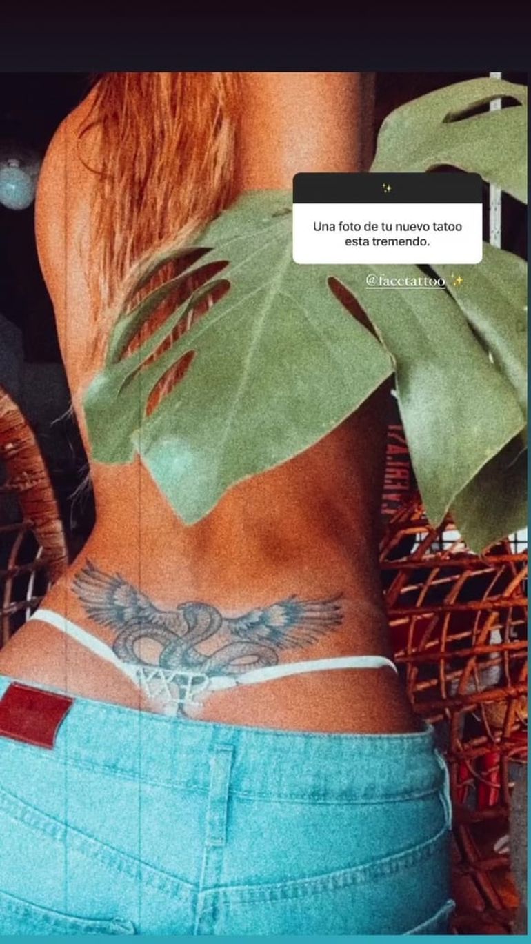 Para contarles de qué se trataba y en dónde decidió hacérselo subió un video bailando y luciéndolo en primera plana. Se trata de una serpiente que se encuentra medianamente enrollada a la cual le agregó alas de gran tamaño. ¿Cuál será el significado que tendrá para ella?