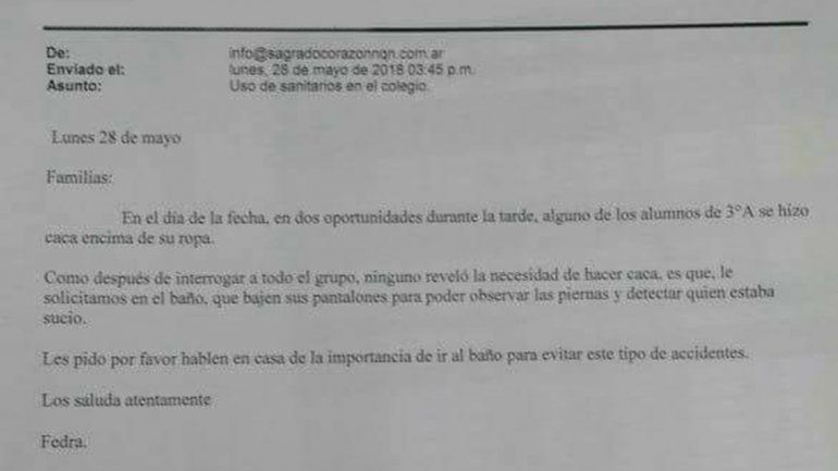 “Como después de interrogar a todo el grupo, ninguno reveló la necesidad de hacer caca, es que, le solicitamos en el baño, que bajen sus pantalones para poder observar sus piernas y detectar quien estaba sucio”, dice el mail del colegio que recibieron los padres.