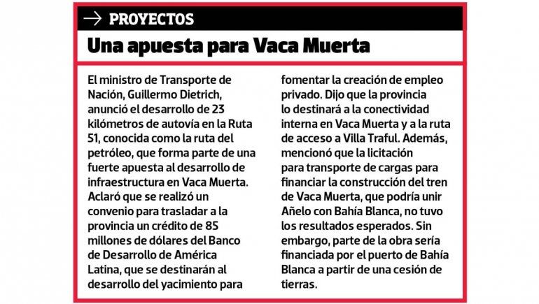 Entre ellos, mencionó el desarrollo de la Ruta 51, con 23 kilómetro de autovía, y los avances en la Ruta 22 en el tramo que va de Plottier a Senillosa. Sobre este proyecto, aclaró que solo falta desarrollar la demarcación de las vías y que las tareas continuarán hacia Arroyito. En el plazo de un año se podría terminar el sector urbano de Senillosa y en unos seis meses culminar el sector siguiente hacia Arroyito.