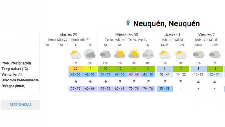 Desde el Servicio Meteorológico Nacional emitieron una alerta por vientos intensos, por lo cual, se esperan ráfagas de viento de casi 80 kilómetros por hora hasta el próximo miércoles. Sin embargo, el pronóstico extendido indica que el fuerte temporal se mantendrá hasta el jueves.