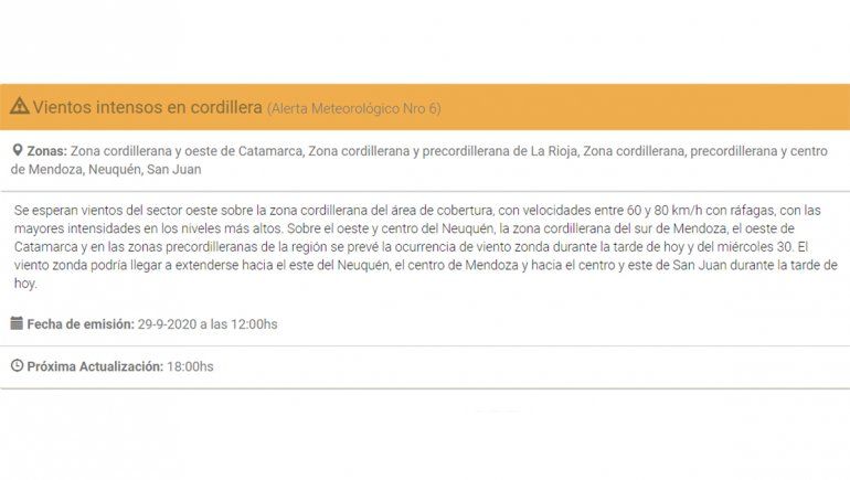 “Se esperan vientos del sector oeste sobre la zona cordillerana del área de cobertura, con velocidades entre 60 y 80 km/h con ráfagas, con las mayores intensidades en los niveles más altos. Sobre el oeste y centro del Neuquén, la zona cordillerana del sur de Mendoza, el oeste de Catamarca y en las zonas precordilleranas de la región se prevé la ocurrencia de viento zonda durante la tarde de hoy y del miércoles 30. El viento zonda podría llegar a extenderse hacia el este del Neuquén, el centro de Mendoza y hacia el centro y este de San Juan durante la tarde de hoy”, explica el comunicado.