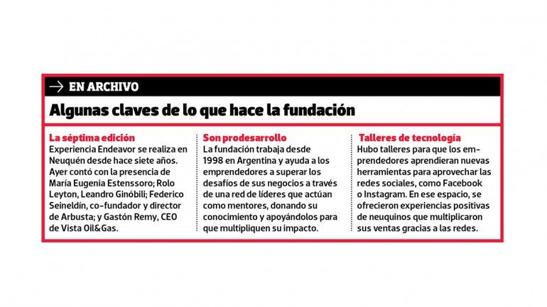 Natalia Muguerza también estuvo presente en la Experiencia Endeavor, cuyo escenario recibió a destacadas personalidades como Leandro Ginóbili y Marcos Patronelli. La neuquina es despachante de aduanas y hace cuatro años creó, junto con otros dos socios, un depósito fiscal que busca potenciar las exportaciones e importaciones de la zona a través del aeropuerto local y la ruta del Pacífico.