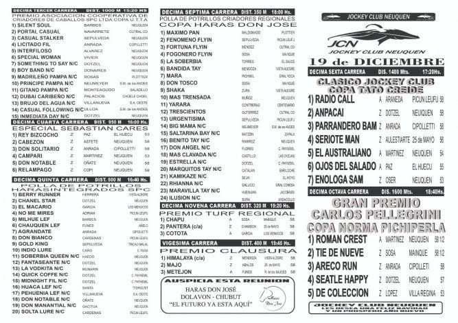 Otra de las pruebas destacadas será en el decimoquinto turno con el Clásico Jockey Club, Copa Tato Creide, sobre 1400 metros desde las 17:40 con siete competidores en partidores: Anpacai, Parrandero Bam, Seriote Man, Ojos del Salado, Enolaga Sam, Radio Call y El Australiano.