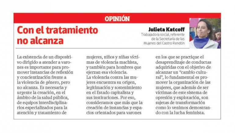 “No creo que sea fácil. Hay casos que hemos visto que han funcionado muy bien, han sido ‘alumnos perfectos’, tuvieron la contención del grupo, pero volvieron a ejercer violencia. La violencia no es un fenómeno aislado, se da en el marco de una sociedad determinada en un tiempo determinado. En la mayoría de nuestros casos, los varones que ejercen violencia tienen consumo problemático de drogas, están desocupados. Aunque vuelvo a decir que no hay que estigmatizar ni tampoco esto los justifica. Por ahí uno también se cuestiona, ¿un problema social se resuelve solo con justicia penal? No”, planteó la fiscal, haciendo referencia a que la mayoría de los casos que llegan a ser denunciados y judicializados son una proporción que en muchas ocasiones se corresponde con clases sociales más humildes, lo que no significa que no se ejerza violencia en las clases sociales más pudientes.