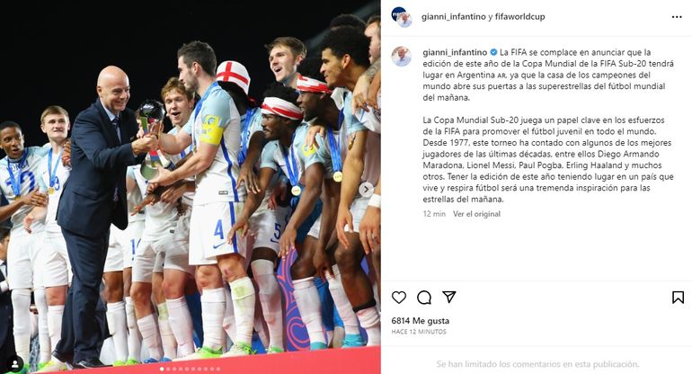 El titular de la entidad que regula el fútbol mundial publicó este lunes en las redes sociales el posteo que oficializa la noticia. "La FIFA se complace en anunciar que la edición de este año de la Copa Mundial de la FIFA Sub-20 tendrá lugar en Argentina, ya que la casa de los campeones del mundo abre sus puertas a las superestrellas del fútbol mundial del mañana", comienza el comunicado.