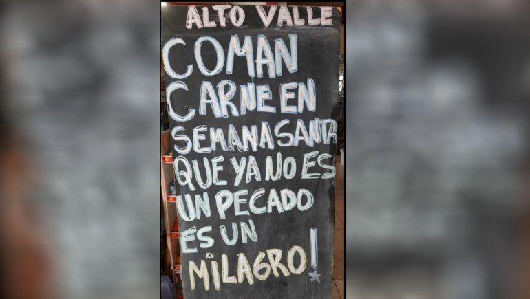 "coman carne en Semana Santa que ya no es pecado, es un milagro", reza el cartel que capta la atención de todos y de todas. Un resúmen de la realidad que nos toca vivir, y cuyo sacrificio es digno de pagar culpas propias y ajenas.