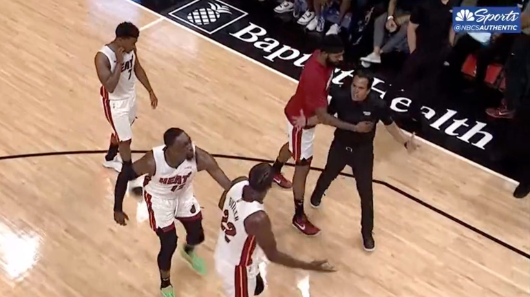 La tensión llegó hasta un punto en el que el resto de miembros de los Heat, con 47 victorias y 26 derrotas, tuvieron que separar a Butler, a Spoelstra y también a Udonis Haslem, que se posicionó del lado de su entrenador.