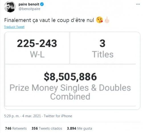 Pero el escándalo del francés, no sólo quedó en la cancha, también lo trasladó a las redes sociales. A tráves de su cuenta de Twitter, Paire mandó a callar a quienes lo criticaron, metió un emoji polémico y mostró una captura del precio en millones de lo que ganó a lo largo de su carrera profesional.