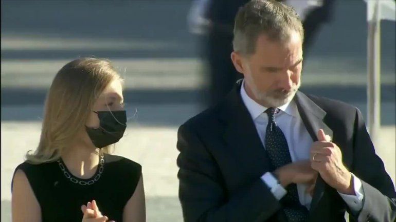 Ante las palabras de la Princesa Leonor, el Rey Felipe VI sacó del bolsillo interior de su saco el barbijo y haciéndole caso a su hija se lo colocó con prudencia.