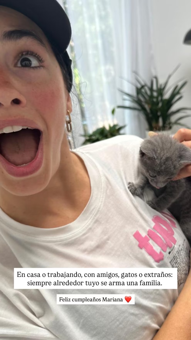 “En casa o trabajando, con amigos, gatos o extraños: siempre alrededor tuyo se arma una familia. Te amo Mariana”, escribió el periodista, utilizando el nombre de pila de la artista junto al emoji de un corazón rojo. La foto inmortaliza a Lali de medio perfil en la intimidad de su casa, con un gesto de sorpresa, la boca abierta y sosteniendo en sus brazos a su gato Pelusa.