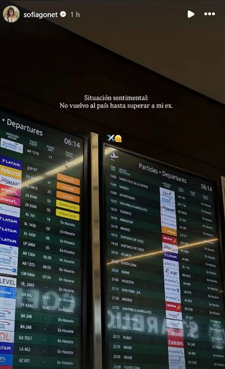 "Situación sentimental: no vuelvo al país hasta superar a mi ex", fue la historia que compartió la Reini, como la apodan en redes, en su cuenta mostrando el tablero con los horarios de los vuelos.