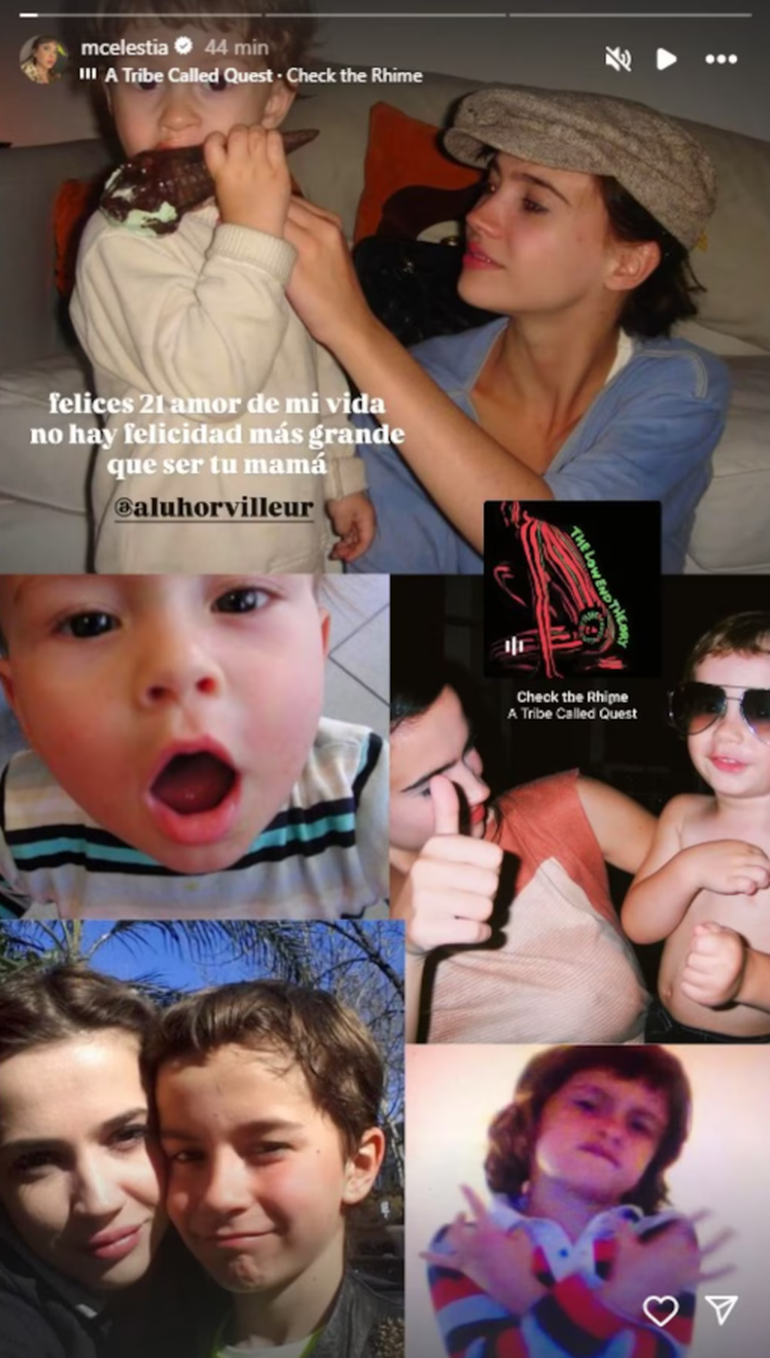 Las fotos elegidas reflejaron la complicidad de todos estos años. En una de las postales, Celeste aparece con una boina gris y camiseta blanca, tomada de la mano de un pequeño André vestido con una camiseta celeste y blanca. Otra imagen lo muestra de niño con el rostro en primer plano, mientras que en distintas secuencias madre e hijo posan juntos usando gafas oscuras, riendo y jugando frente a la cámara. También incluyó un retrato luminoso donde el joven sonríe con naturalidad y otra postal con una camiseta púrpura que denota el paso del tiempo y la transformación hacia la adultez.