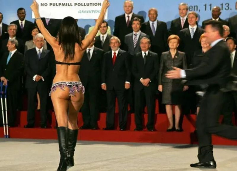 En Viena, Austria, el 12 de mayo de 2006, en medio de la celebración de la IV Cumbre Unión Europea-América Latina y el Caribe, con un diminuto traje, realizó una protesta delante de presidentes, contra la instalación de la papelera uruguaya frente a las costas de Gualeguaychú. Su imagen fue una de las más vista en el mundo allá por 2006, cuando se llevaba a cabo la IV Cumbre Unión Europea-América Latina y el Caribe, cuando se presentó reclamando por la instalación de plantas de celulosa sobre la orilla del Río Uruguay.
