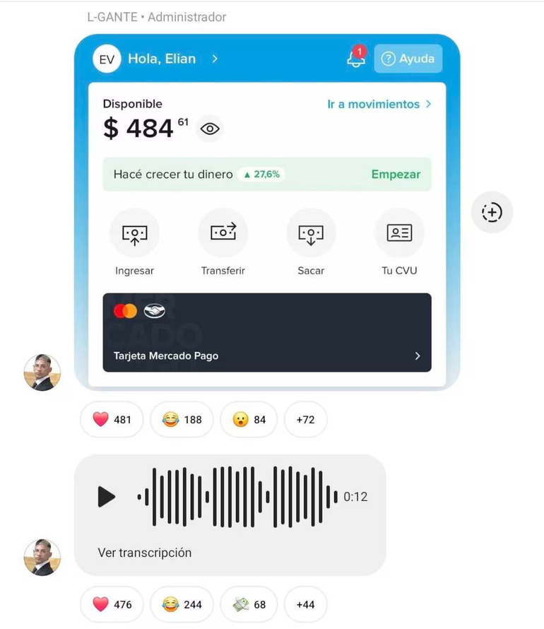 El domingo por la madrugada, envió un audio de 12 segundos junto a una captura de pantalla de su cuenta de Mercado Pago. "¿Vieron que yo les regalo plata siempre?", comentó el músico. "Miren como quedó mi cuenta de Mercado Pago, a ver quién se pone la 10 y me pasa un billete a mí", agregó.