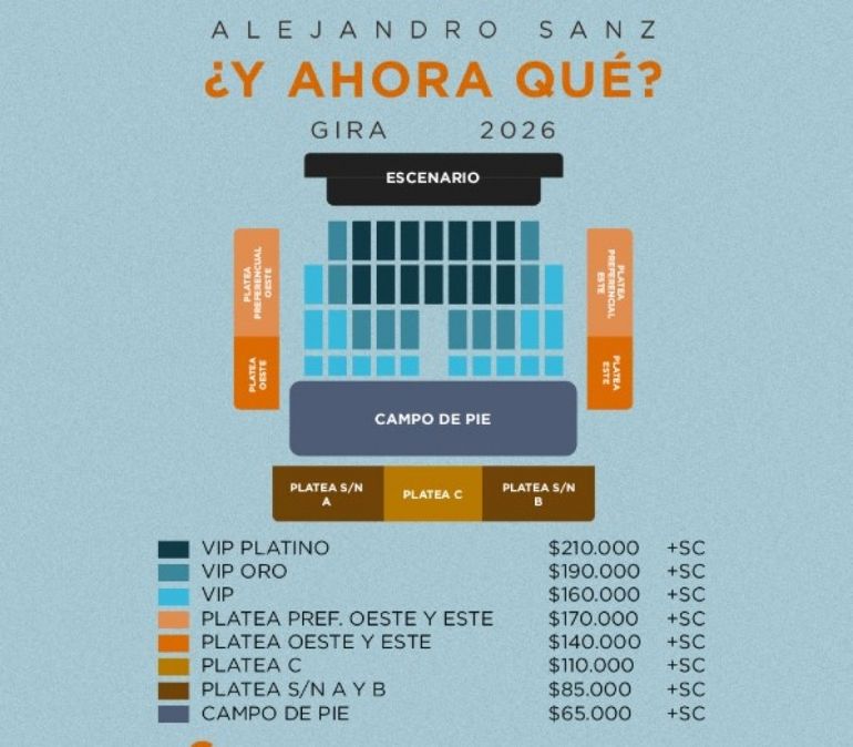- Platea Preferencial Oeste y Este: $170.000 + SC