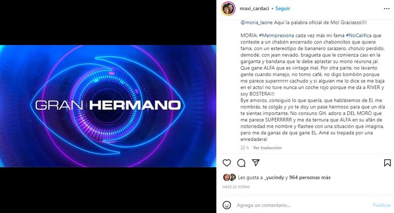 Y agregó, desde la cuenta de Instagram de Maxi Cardaci, su representante: “Por otra parte, no levanto gente cuando manejo, no tomo café, no digo bombón porque me parece super cachudo y si alguien me lo dice se me baja en el acto. No tuve nunca un coche rojo porque me da a River y soy bostera”