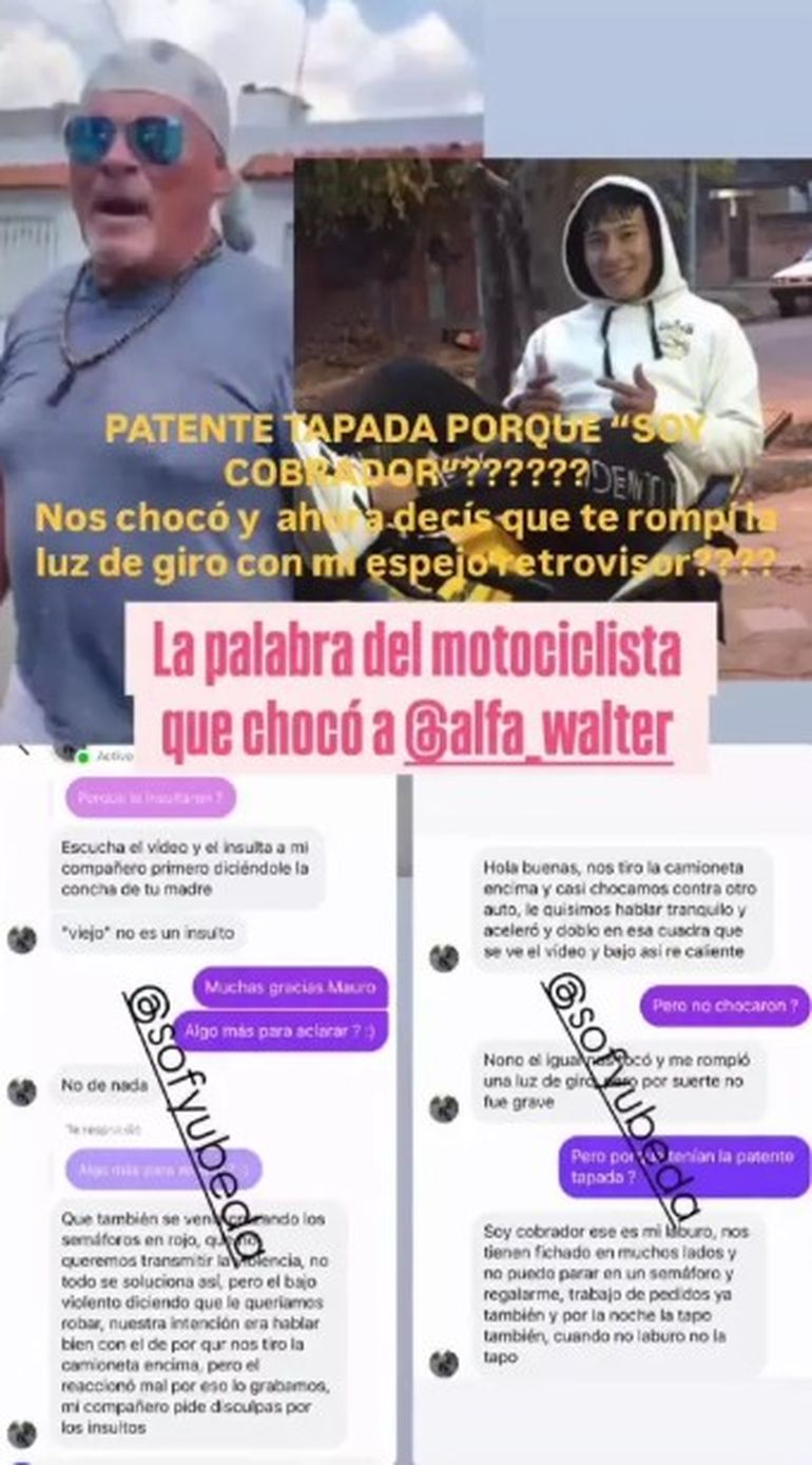 "Soy un cobrador. Ese es mi laburo. Nos tienen fichados en muchos lados y no puedo parar en un semáforo y regalarme", contó en chat. Luego sumó: "Él bajó violento diciendo que lo queríamos robar. Nuestra intención era hablar bien con él de por qué nos tiró la camioneta encima. Pero reaccionó mal. Por eso lo grabamos".