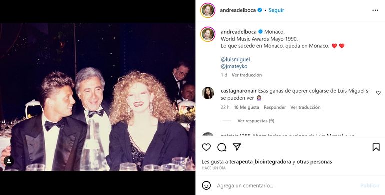 “Monaco. World Music Awards Mayo 1990”, escribió Andrea del Boca junto a la foto en la cual se puede ver a Luis Miguel mirándola obnubilado y en la cual se encuentra acompañado de Juan Alberto Mateyko. Además eligió poner como cortina de la imágen la canción “Cuando calienta el Sol”.