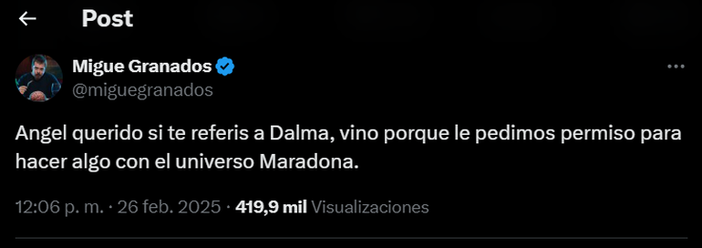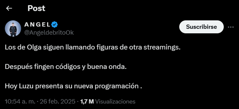 Todo comenzó cuando de Brito, conductor de streaming y tv, se expresó en su perfil de X, “Los de Olga siguen llamando figuras de otros streamings. Después fingen códigos y bueno onda”, expresó afectado por la situación. Ante su mensaje tan directo, el encargado de responder fue Migue Granados que, sin vueltas, explicó porque llamaron a la hija del 10.