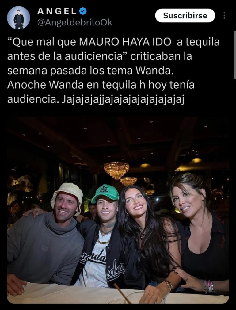 Hace unas semanas, cuando le tocó a Icardi ir a una audiencia judicial, fue atacado en las redes sociales por haber salido la noche anterior. Sin embargo, Wanda siguió los mismos pasos y se fue a un boliche de la costanera junto a L-Gante, Zaira y Facundo Pieres. Ante lo sucedido, Ángel de Brito se expresó en su cuenta de Twitter y apuntó contra la mediática: "'Que mal que Mauro haya ido a Tequila antes de la audiencia', criticaban la semana pasada los team Wanda. Anoche Wanda en Tequila y hoy tenía audiencia".