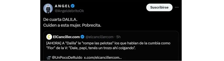Por esa razón, inmediatamente después de que se viralizara el clip, los internautas mostraron su malestar y estallaron en contra de la interprete asegurando que "se fue al pasto". Incluso, Ángel de Brito se metió en el escándalo y repudió estos dichos pese a que su relación con su colega no es la mejor: "De cuarta Dalila. Cuiden a esta mujer pobrecita".