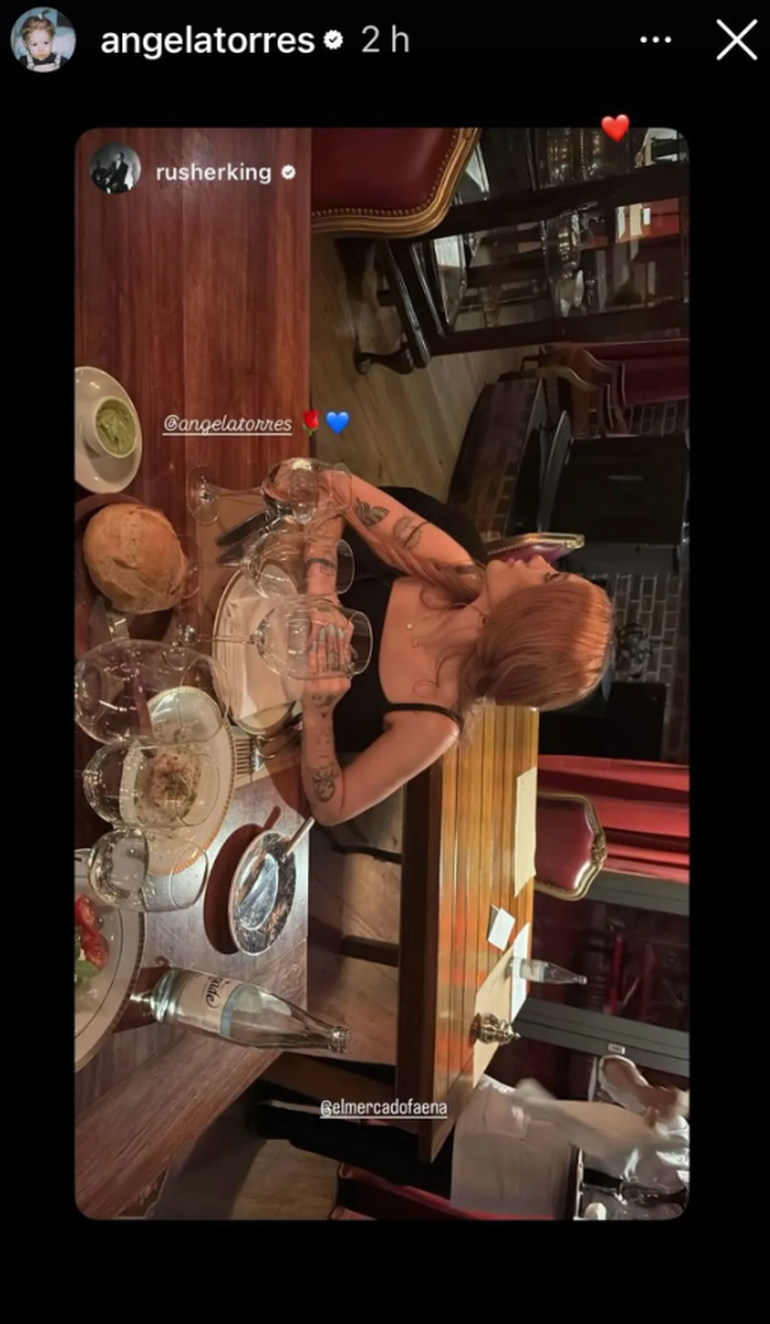 En esta oportunidad fue el perfil “Gossipeame” donde se hicieron públicas las imágenes vía stories como prueba de la reconciliación entre Angela y Rusherking. A través de su columna digital “no noticias”, la instagramer compartió una foto de Ángela y Rusherking. Con el objetivo de sumar información al posteo, también detalló: estaban "cenando ayer a la noche por San Valentín en el Faena".