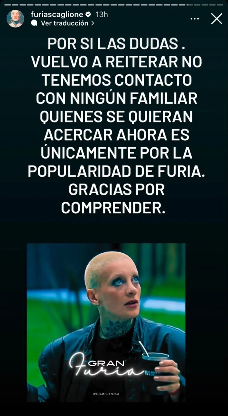 "Por si las dudas vuelvo a reiterar: no tenemos contacto con ningún familiar. Quienes se quieran acercar ahora es únicamente por la popularidad de Furia. Gracias por comprender", cerró sobre este asunto sin dar más información.