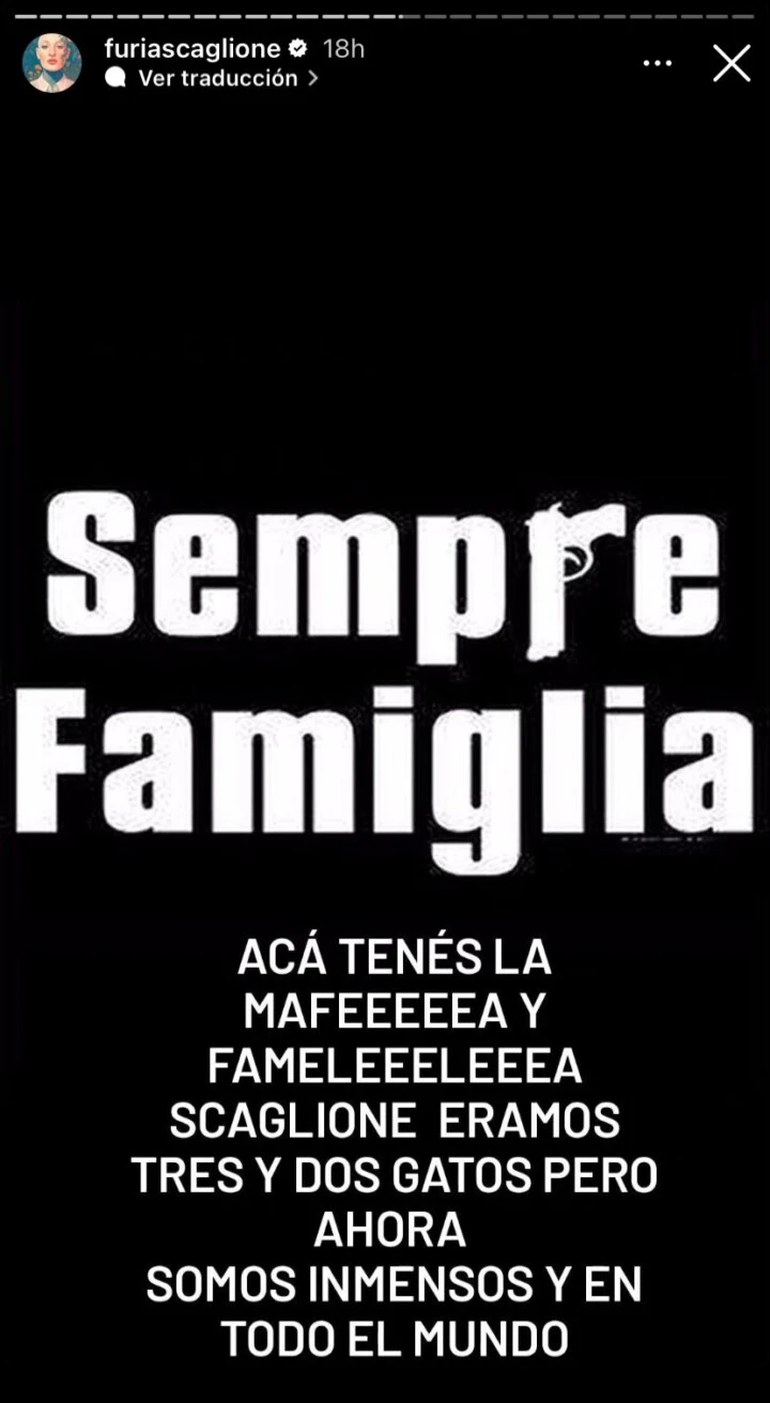 Para dejar en claro su descontento con esta situación, Coy, la única integrante de su familia que Furia considera digna, también hizo una serie de descargos en Instagram. "Acá tenés la mafia. Familia éramos tres y dos gatos, pero ahora somos inmensos y en todo el mundo", escribió en una historia.